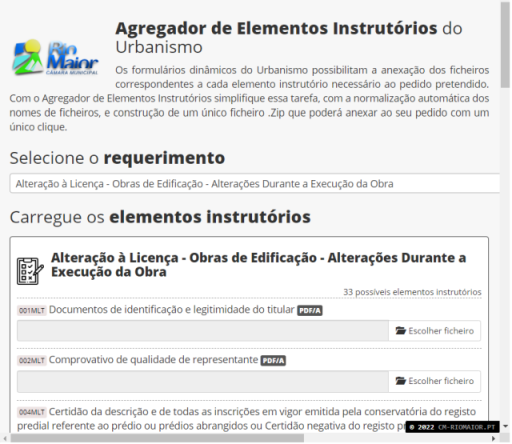 Os formulários dinâmicos do Urbanismo possibilitam a anexação dos ficheiros correspondentes a cada elemento instrutório necessário ao pedido pretendido.